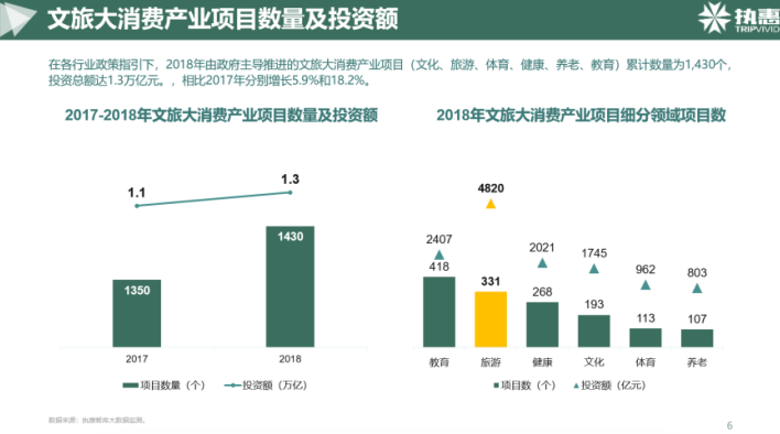 在各行業政策指引下,2018年由政府主導推進的文旅大消費產業項目:累計數量為1430個,投資總額達1.3萬億元,相比2017年呈現出上漲趨勢。單獨的旅游板塊的項目數量為331個,在這六大板塊里排名第二,而投資總金額高達4,820億元,傲居六大板塊之首。從中我們可以看出,宏觀市場在過去一年的反應是積極響應政策指引,資本也大量跟進進行重點布局。