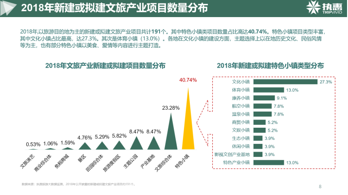 近年來,多個土地、金融、產融結合等政策的出臺有效帶動了特色小鎮和文旅綜合體等目的地類項目的繁榮發展。從數量上看,2018年以旅游目的地為主新建或擬建文旅產業項目共計191個,其中特色小鎮類項目數量占比高達40.74%,其次是文旅綜合體,占比23.28%。從投資金額上看,新建或擬建文旅綜合體項目投資總額高達2.24萬億,特色小鎮則是8,443億。