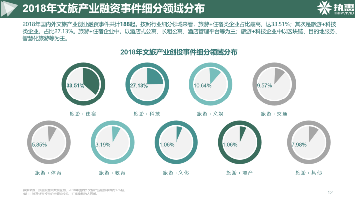 2018年國內外文旅產業融資事件共計188起,那我們從這張圖上也能看出來資本市場在文旅大消費在領域的綜合動態,其中投資旅游+住宿類項目融資占比最高,達33.51%;其次是旅游+科技類企業,占比27.13%。