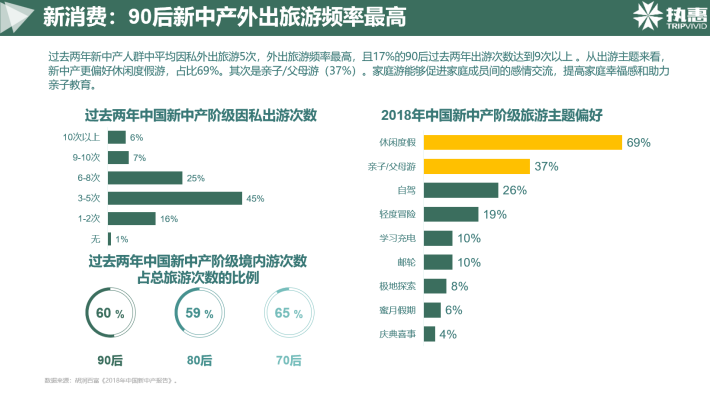 過去兩年新中產人群中平均因私外出旅游5次,特別值得注意的是,90后踐行“趁著年輕去旅游”的生活理念,外出旅游頻率最高,經統計,17%的90后過去兩年出游次數達到9次以上。從出游主題來看,新中產更偏好休閑度假游,占比69%。其次是親子/父母游,占比37%。