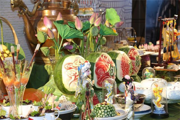 在文化創意主題宴席比賽環節,各酒店更是“使勁渾身解數”“拿出看家本事”。在銀座泉城大酒店宴席,一個外形雕刻精致細膩的空心西瓜中,一只雞靜靜地臥于其中。甫一上桌,這道泉水西瓜雞就賺足評委們的眼球。山東東方大廈創新性打造的“東方琉璃喜宴”,也給評委們留下深刻印象。索菲特銀座大飯店的齊魯文化名宴,以齊魯十二名人故事為背景,打造出“草船借箭”“孟母三遷”“藕花深處”等形神皆備的菜品,再配上獨具特色的敬茶禮,中國傳統文化、儒家文化于無聲處滲透到每位賓客心中。舜耕山莊的上合孔府家宴、山東禧悅東方大酒店的東方魯韻宴、中豪大酒店的雨荷素食宴、銀座泉城大酒店的泉水主題宴等也頗具特色。