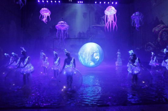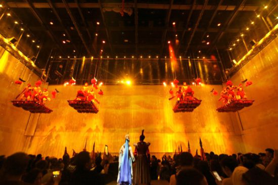 為了最大限度地豐富劇場空間層次,滿足劇情對(duì)布景和場地的要求,更好地突顯演出效果,《沙坡頭盛典》斥巨資建造了國內(nèi)最大的整體升降舞臺(tái),總面積400平方米,載重400噸,升程6.9米,可容納500人同時(shí)升降,無論是面積、載重、可容納人數(shù)均為國內(nèi)第一。通過整體升降舞臺(tái)不同的高度變化,盛典劇目可以輕松實(shí)現(xiàn)舞臺(tái)場景轉(zhuǎn)換、上下移動(dòng)演員和觀眾,制造出高低起伏、層次錯(cuò)落的舞臺(tái)畫面,從而改變觀眾觀演視角,增強(qiáng)觀眾體驗(yàn)度,讓觀眾身浸其中,體驗(yàn)驚險(xiǎn)、刺激、震撼、唯美的獨(dú)特感受。