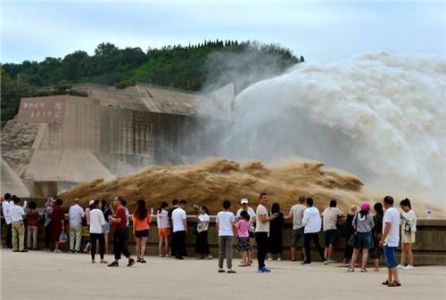 黃河小浪底水利樞紐工程,是體現黃河歷史文化和自然風光的大型山岳湖泊型風景區,296平方公里的水域中湖汊河巷密布,具有“北方千島湖”、“中原北戴河”的美譽。雙節期間,恰逢小浪底水庫再次開閘泄洪,黃河激流從壩體中的洞群噴涌而出,形成多條氣勢磅礴的“巨瀑”飛流而下,展現出“黃河之水天上來”的壯觀景象。每天前來觀賞黃河飛瀑奇觀的游客絡繹不絕。